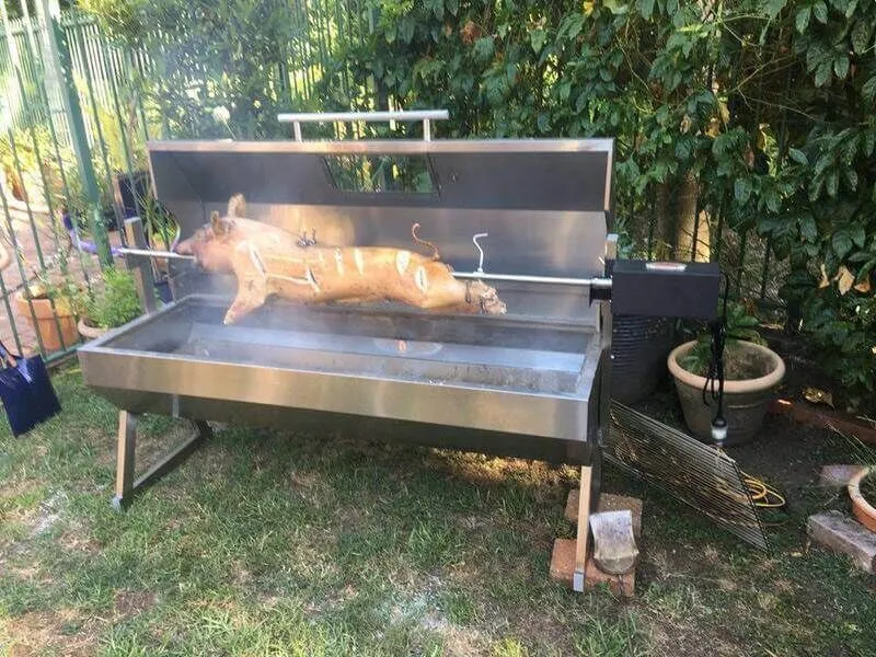 The Hooded Spartan Stainless Spit Rotisserie 1500 by Flaming Coals is a solid and sturdy stainless steel spit roaster capable of cooking the largest of animals. Countless numbers of these spit rotisseries have been sold to restaurants, cafes, butchers and of course, the average home user wanting to cook a whole lamb for Easter. This has to be the best value for money lamb spit in Australia.