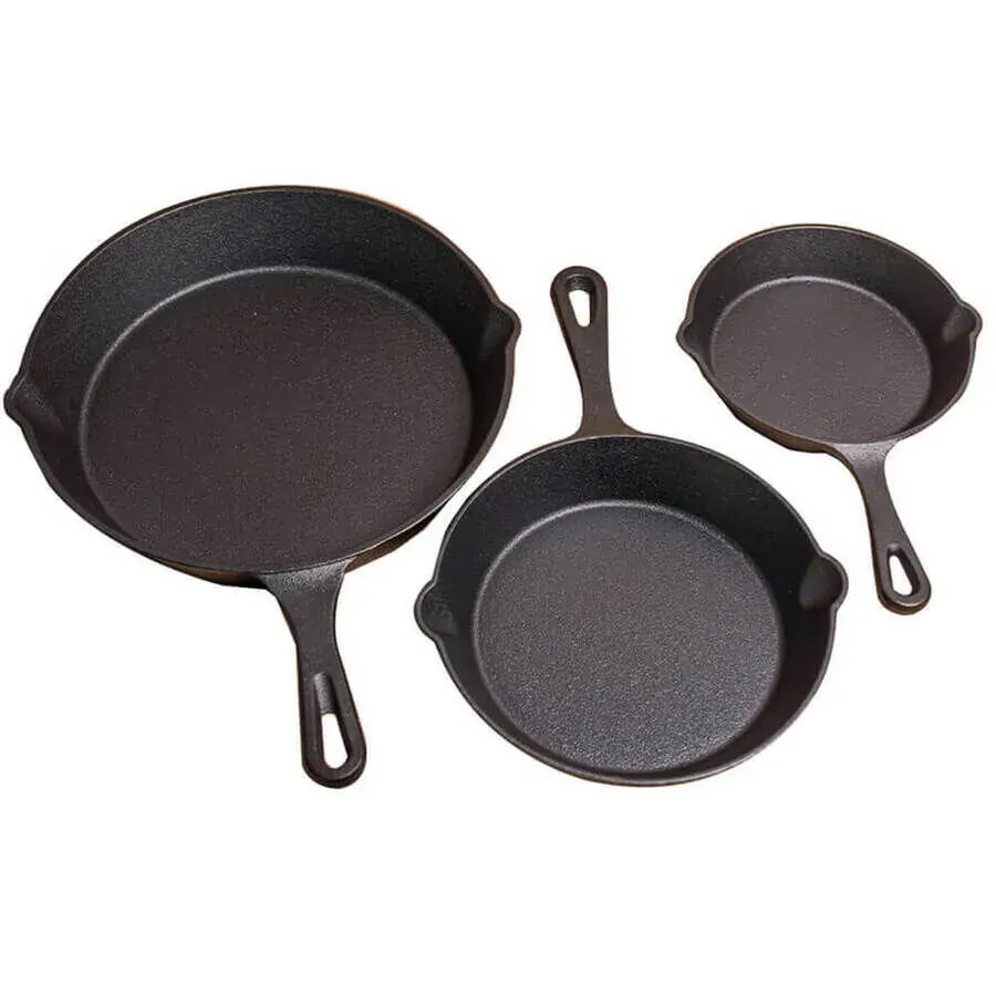 This pre-seasoned 3-piece cast Iron Pan Set is a great kit if you haven't already got any cast iron pans in your cooking arsenal for either your home or camping kitchen. The set has the 3 main sizes you will need, a 16, 19.5 and 24.9cm pan with pouring spouts and integrated handles so you can cook a large steak or even a single egg in the small pan. Cast iron pans offer a lot of benefits including great heat retention and the ability to develop a non-stick coating. They can sear a steak amazingly, keep a constant temperature for deep-frying, and can also be used to bake your favourite cake recipe. Compared to many other types of cookware, which have to be replaced after a period of time, cast iron pans only get better with time as long as you take care of them.