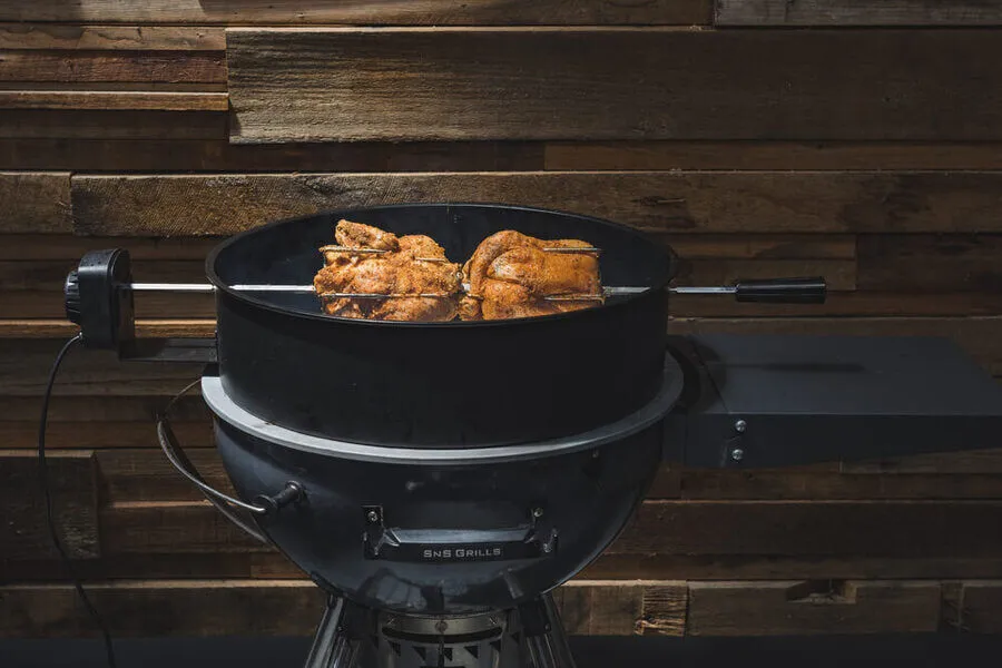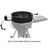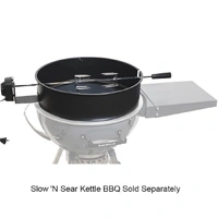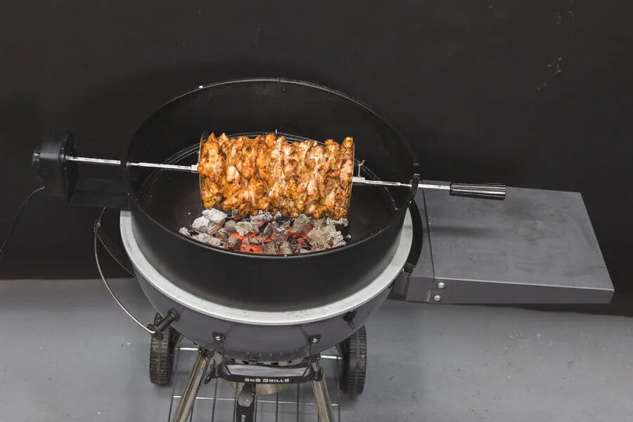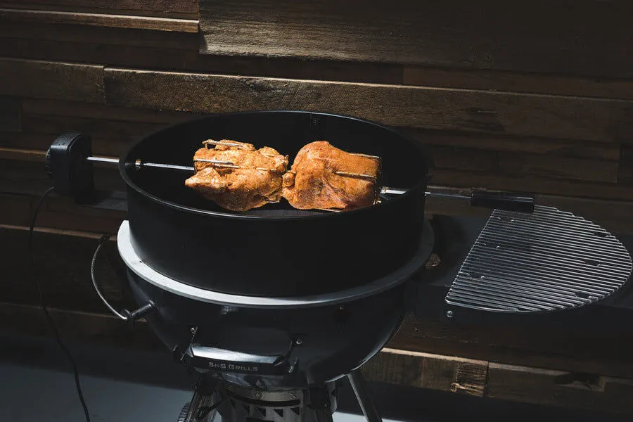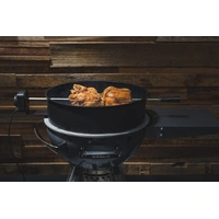 Now you can use your 57cm, 22" Kettle as a smoker, charcoal BBQ and a rotisserie. This spit kit will let you spit roast mouth-water pork, chicken or beef. Nothing beats meat that has been constantly self-marinated in its own juices as it slowly rotates above the charcoal, the kettle|weber rotisserie kit will give you the equipment to cook these delicious meals at home.