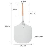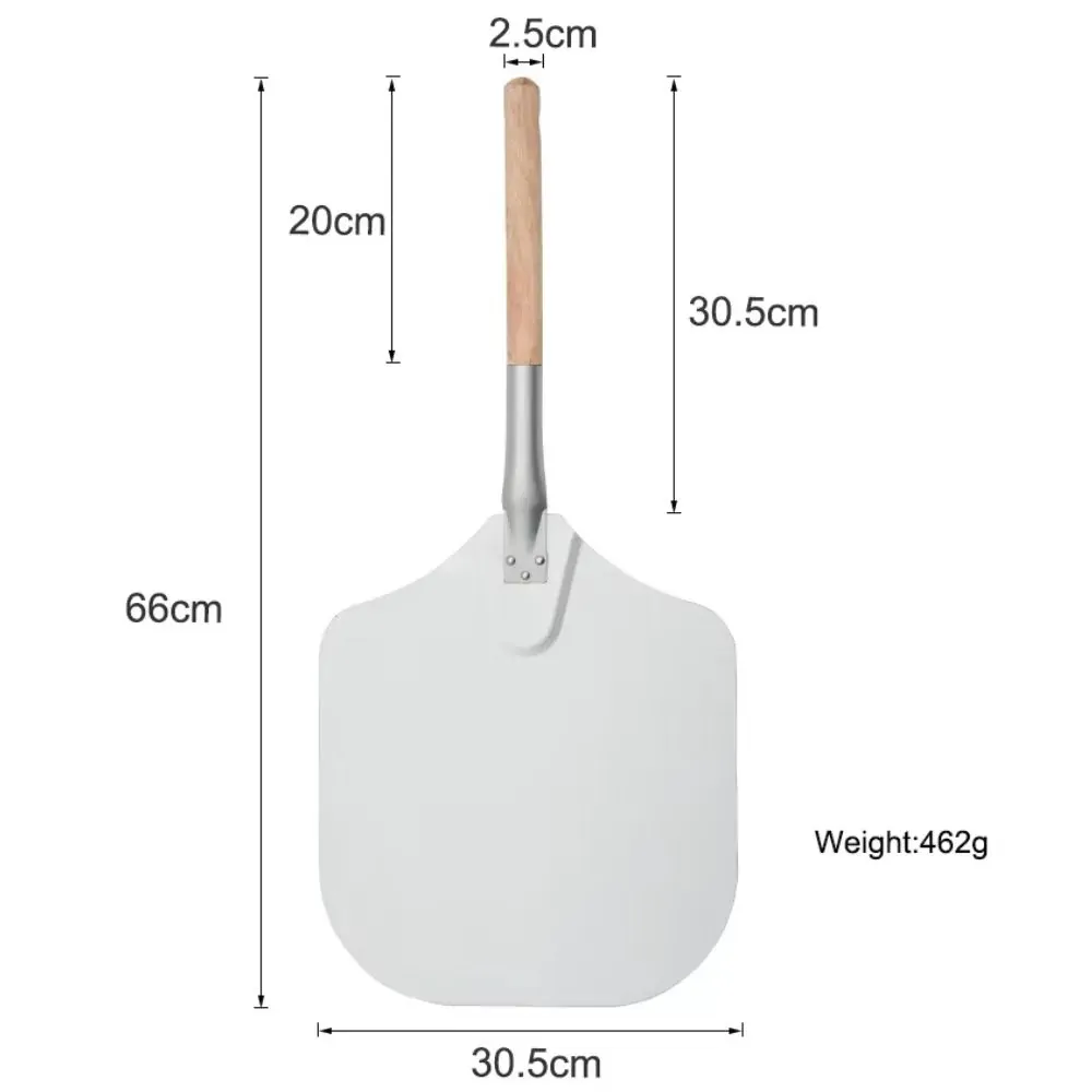 Flaming Coals aluminium pizza peel with wooden handle, 66cm total length, 30.5cm wide blade, 20cm handle section, and weighing 462g.