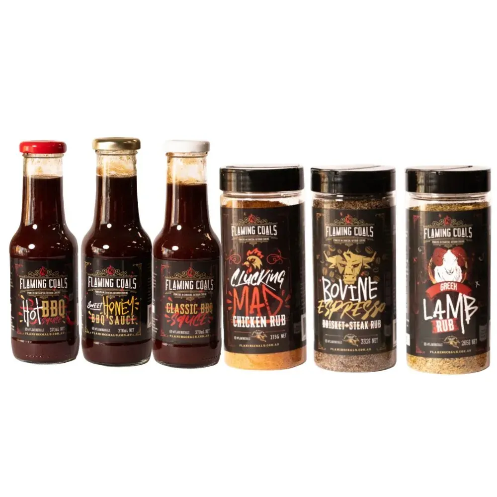 Flaming Coals Rubs and Sauces Combo Pack includes 3 of the new Flaming Coals Sauces and 3 of your favourite Rubs from Flaming Coals!