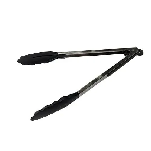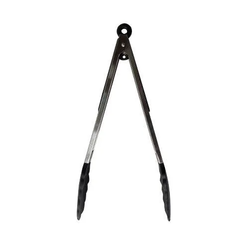 Flaming Coals Silicone Food Tong. 34cm long stainless steel lockable tongs with black silicone tips.