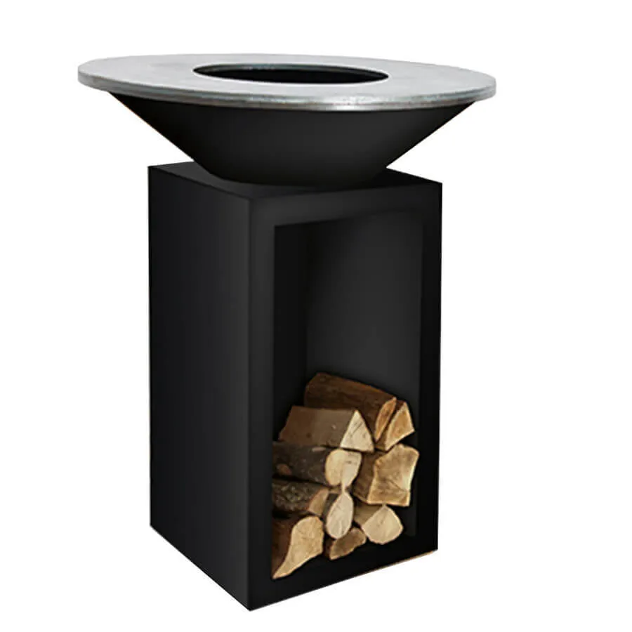 The design and simplicity of the raised fire pit, together with its built-in wooden storage compartment allow you to reach the wood and fuel the fire at any time. The grill plate is designed of 10mm thick black carbon steel that is weather-resistant, heat resistant, and versatile. The ideal colour symbiosis between the natural material and the mirror-like metal surface can be seen in the construction of this grill. The grills rusty appearance radiates elegance and simplicity, as blends in seamlessly with any setting.