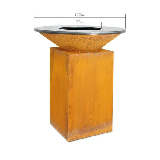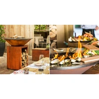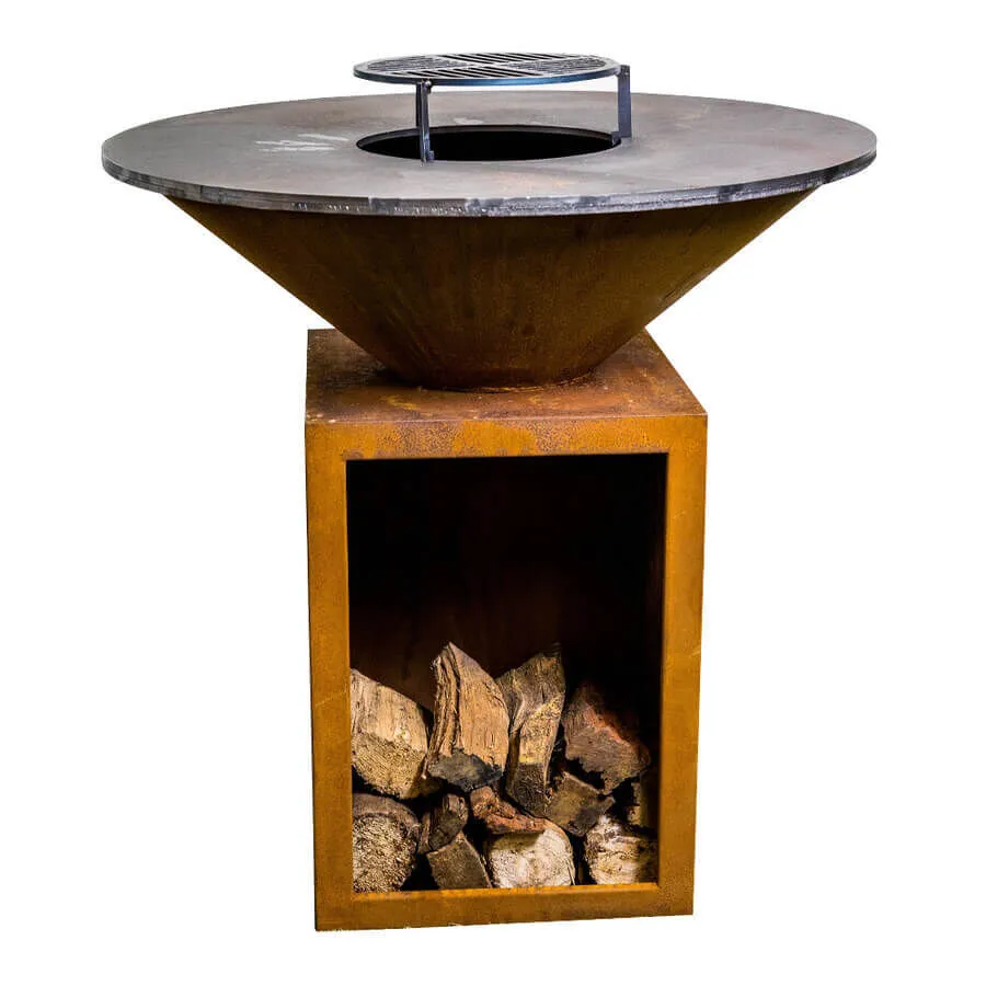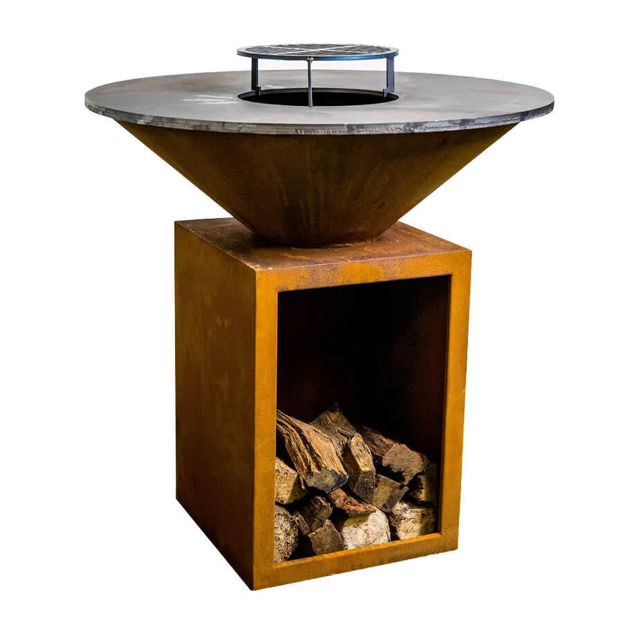The design and simplicity of the raised fire pit, together with its built-in wooden storage compartment allow you to reach the wood and fuel the fire at any time. The grill plate is designed of 10mm thick black carbon steel that is weather-resistant, heat resistant, and versatile. The ideal colour symbiosis between the natural material and the mirror-like metal surface can be seen in the construction of this grill. The grills rusty appearance radiates elegance and simplicity, as blends in seamlessly with any setting.