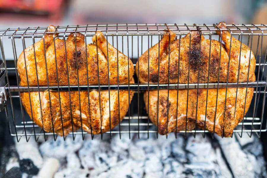 This image shows Spit Rotisserie Multi Use Basket - Large filled in action
