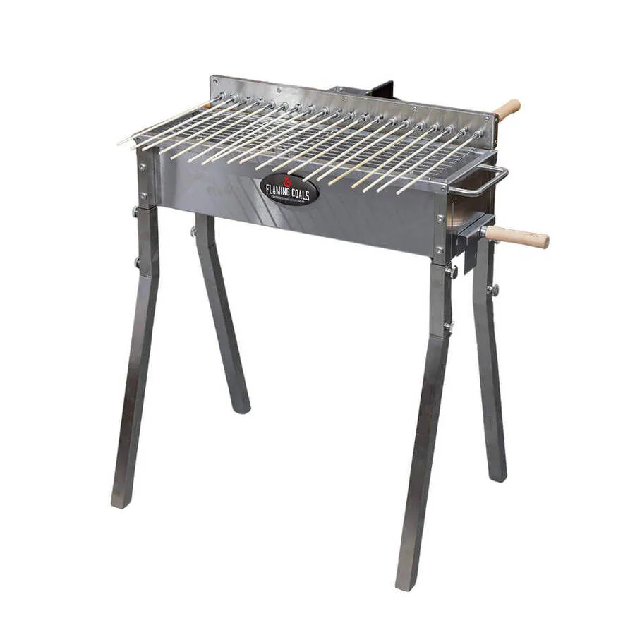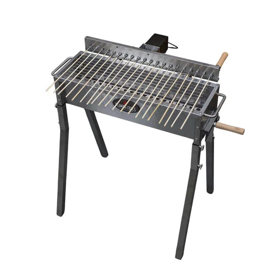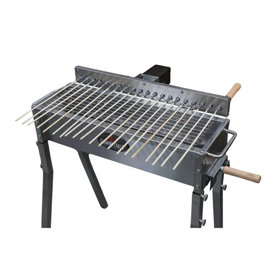 Introducing the Flaming Coals Stainless Steel BBQ with 20 auto-rotating skewers. These narrow charcoal grills are perfect for your favourite Malaysian or Indonesian Satay skewers, French style brochettes, Greek mini souvlaki or kalamaki, Italian Spiedini or Arrosticini.