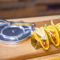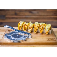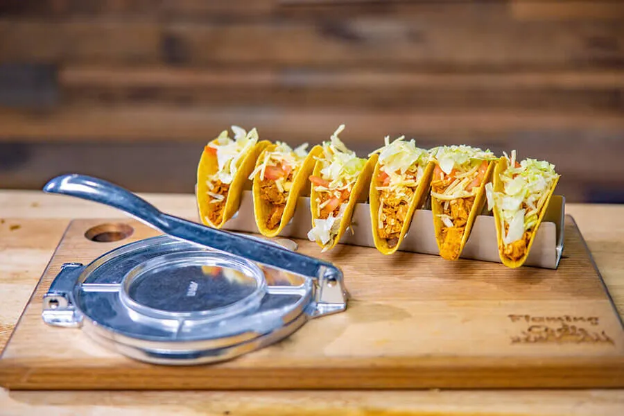 This image shows Taco holder and tortilla press with delicious tacos