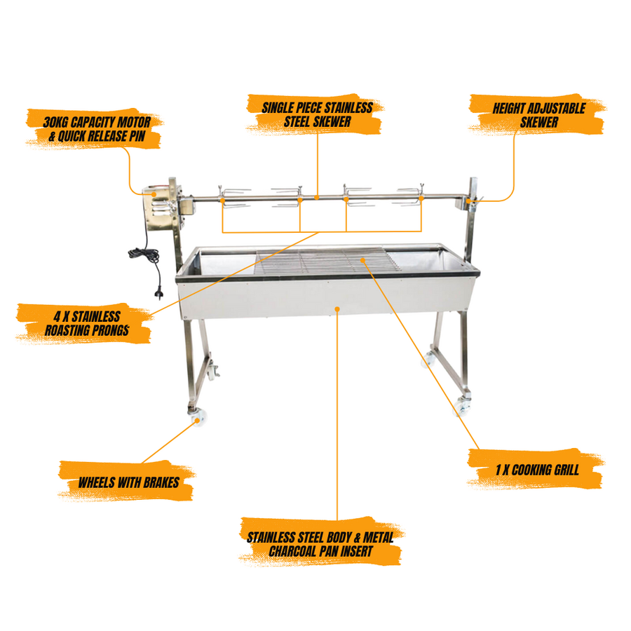 | Accessories Included | 4 x 4-pronged forks, 1 x 22mm round skewer, 1 x 30kg 240v motor, 1 x grill for charcoal BBQ |