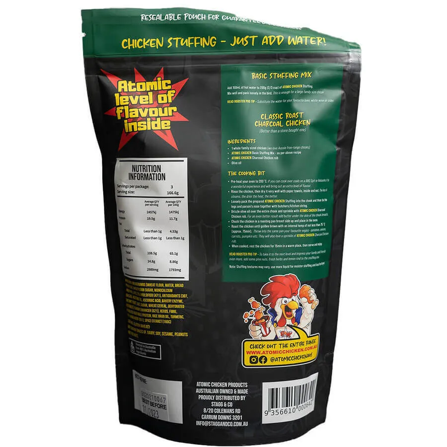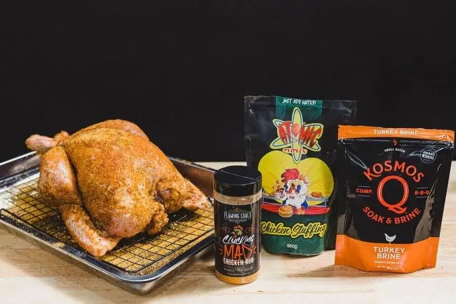 This image shows a whole chicken, Flaming coals clucking mad, Atomic Chicken Stuffing and Kosmos Q Brine.